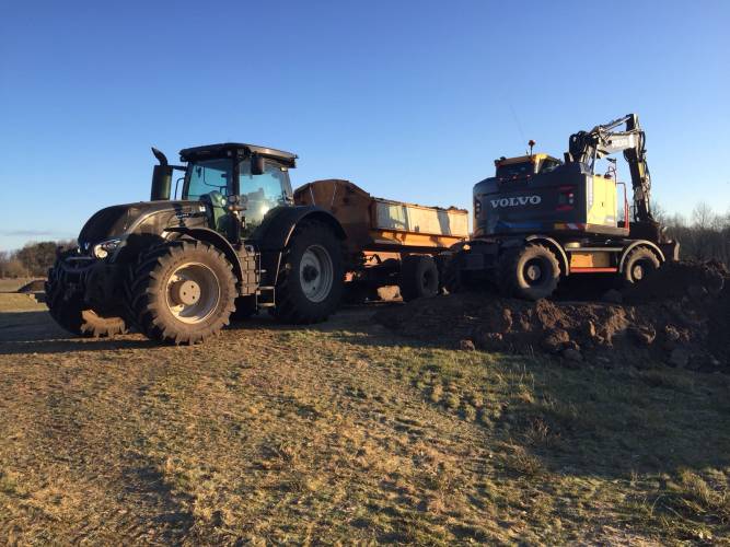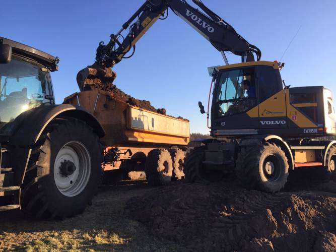 Inzet van Mobiele graafmachine en trekker met gronddumper voor het afvoeren van grond , klei, of leem