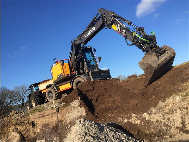 Inzet van Mobiele graafmachine en trekker met gronddumper voor het afvoeren van grond , klei, of leem